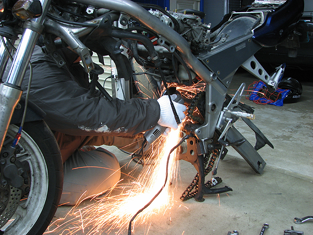 こーなったら内側からスイングアームごとシャフトを切断するしかない! 頑張ってエンジンを降ろす。