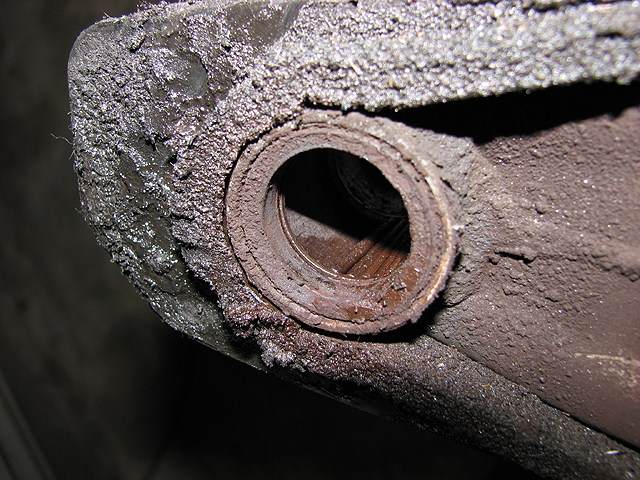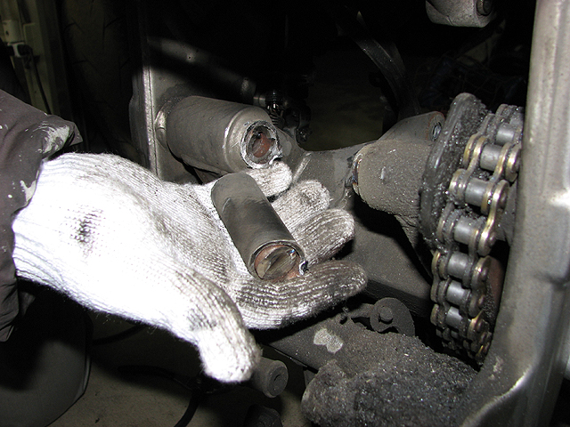 外したスイングアームのベアリング部分。こんな酷いのは初めて見た。