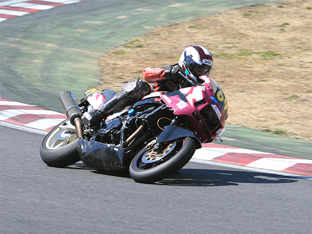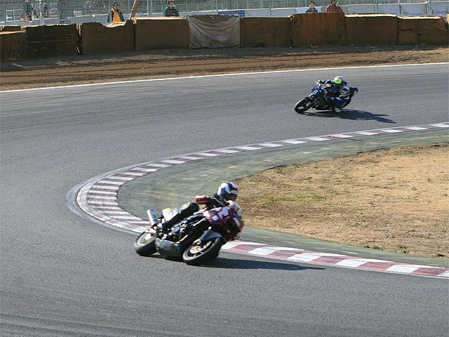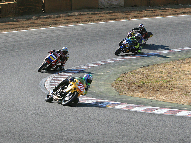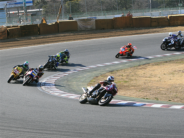 スタート。眼前の黄色いRZがフライング。ぉお田CBRがホールショット。プクダも負けじと後を追う!