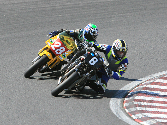 プクダはあっという間に抜かれて4番目に(泣)。清水さんのRZが猛プッシュ!すぐ後では接触事故が・・・