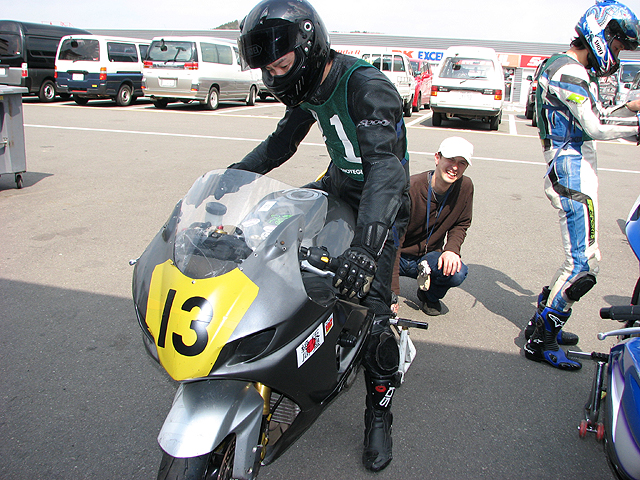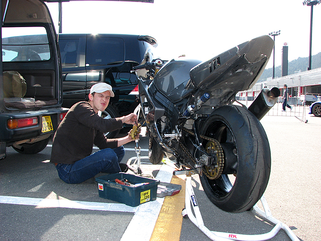 走行前のチェックで広一郎のR1000が車検不合格。整備担当のノアがせっせと修復。