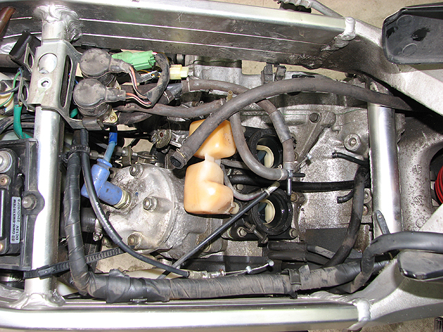 キャブレターを取り外す。公道用ノーマルはオイルポンプ関係のハーネスやチューブがあるのでちょっと面倒。