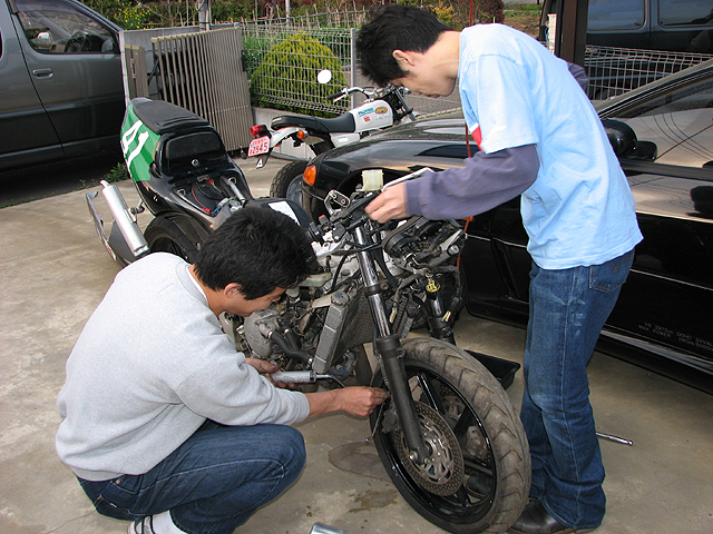 丁寧にオーバーホールして車体に取り付け。バッチ君がエア抜き手伝ってくれた。