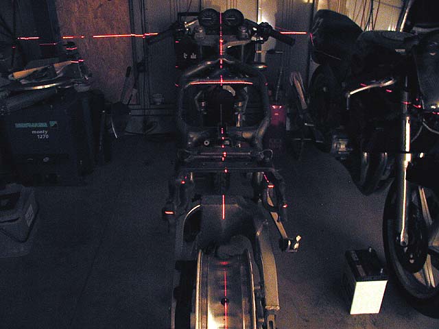 レーザーでセンターを照射して、ホイールのセンターと一致するようにスイングアームのカラーを削って調整する。
