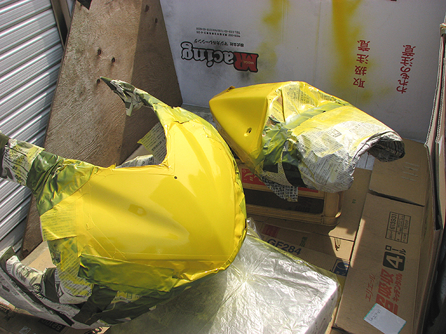 ゼッケン部分の塗装の準備。プクダはエミコが壊したエンジンの修理。