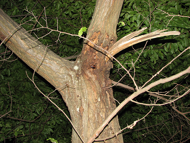 お、何かいるぞ?? ライトで照らしたら木の割れ目に隠れた。