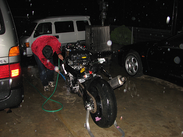 燃料ホースとエアダクト、配線コネクタをテーピングした後、流水で車体各部の泥を落とす。今日の作業はここまで〜