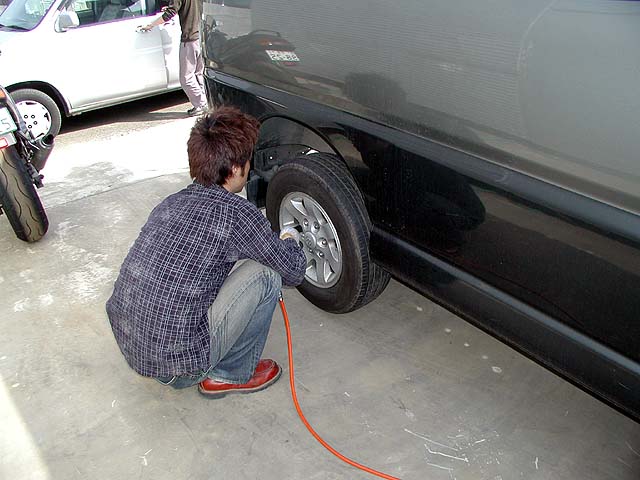 出発予定時間はとっくに過ぎているのに車のタイヤ交換しています。