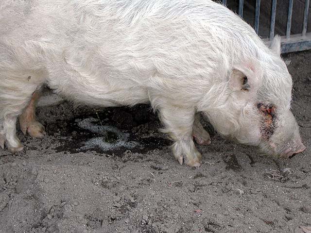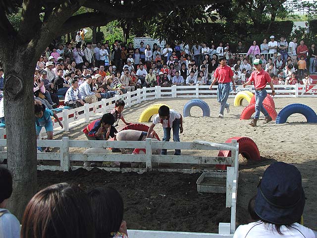 子豚のレース。一等になると金メダルがもらえるので、選手の子供の親がカメラ片手にエキサイトしています。