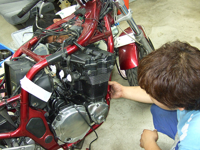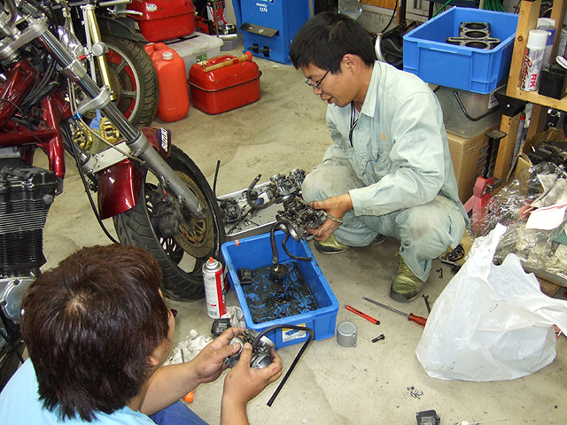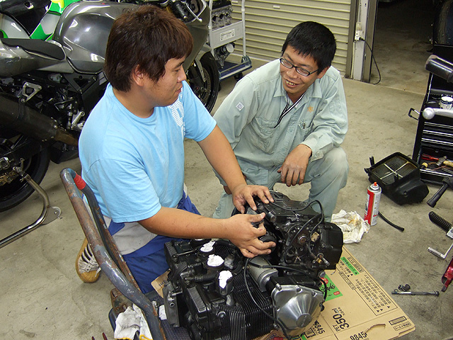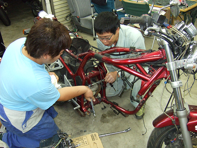ガレージへ行ったら、ツカッチとガチャプィンがいた。GSFにエンジンを載せるらしい。