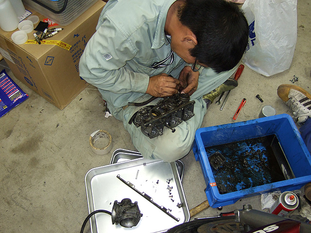 腐りきったキャブレターを分解。ニコイチにする気らしい。