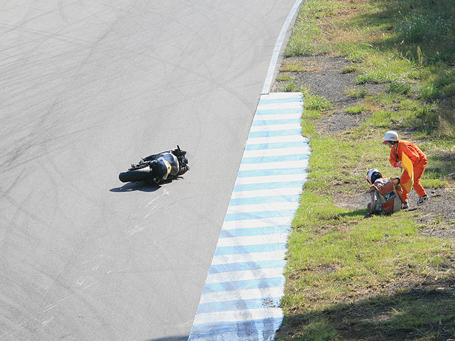 ペースカーが入って何とかピットまで走って来れた。ツナギ破れてボロボロ、体もボロボロ、バイクは元からオンボロ(泣)。