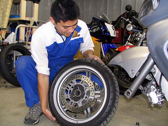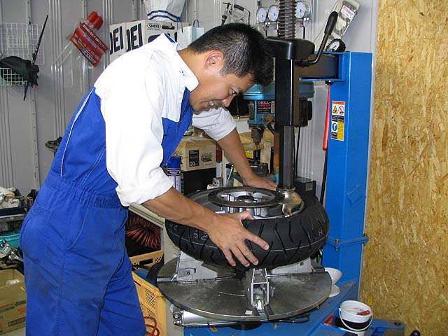 160/60R14。固くて嵌めにくい。バイク用ラジアルでは世界最小径か?